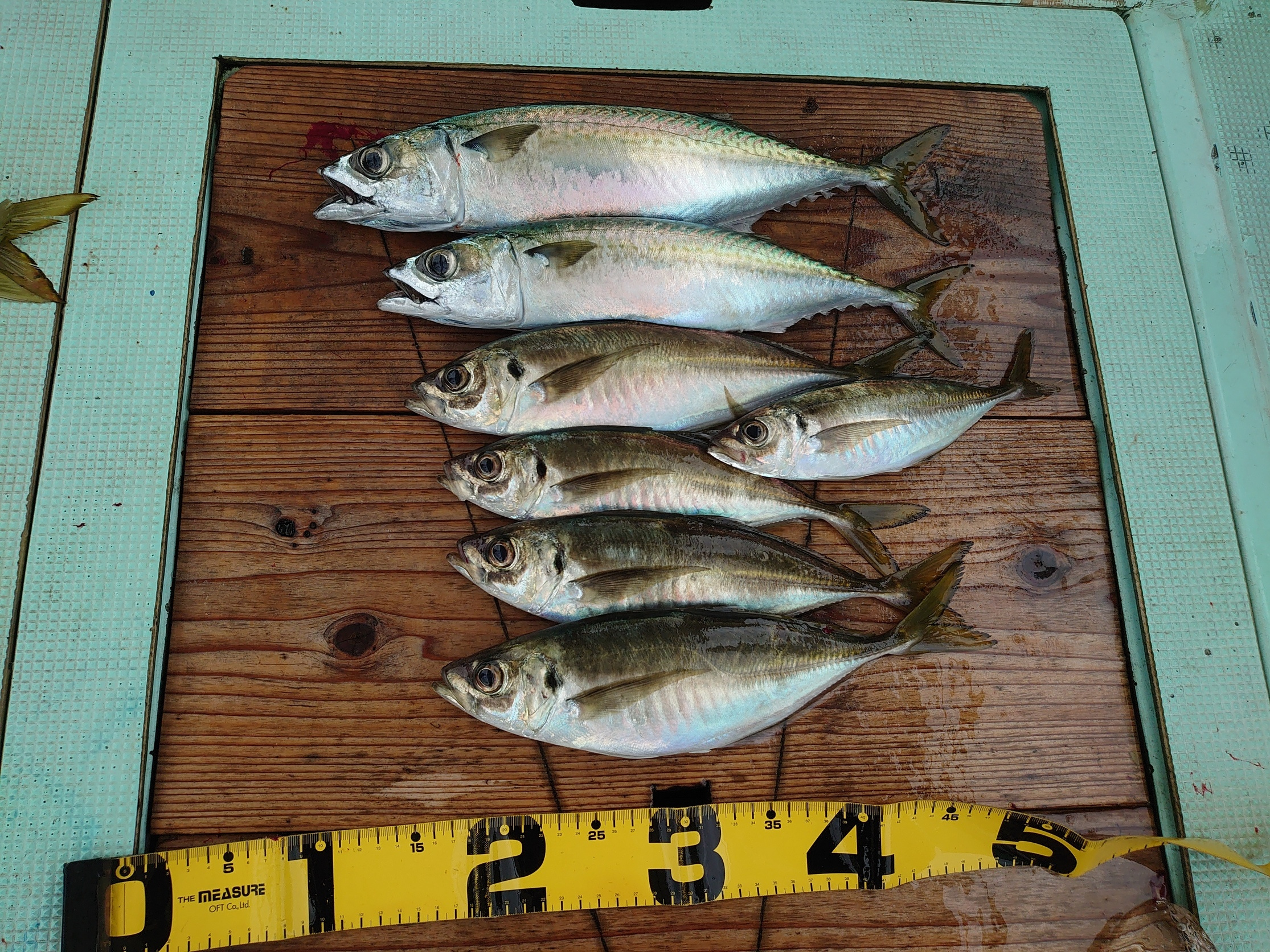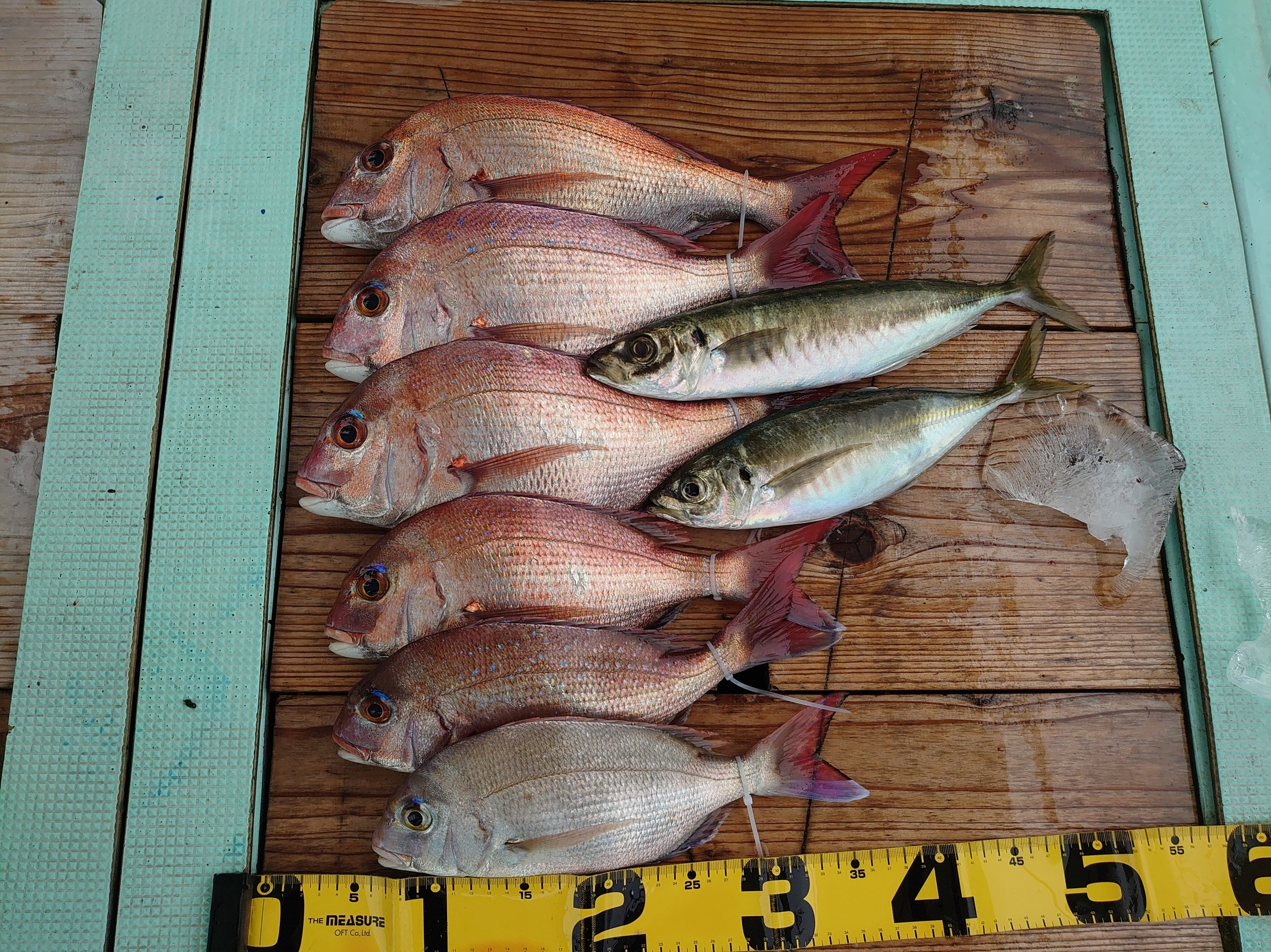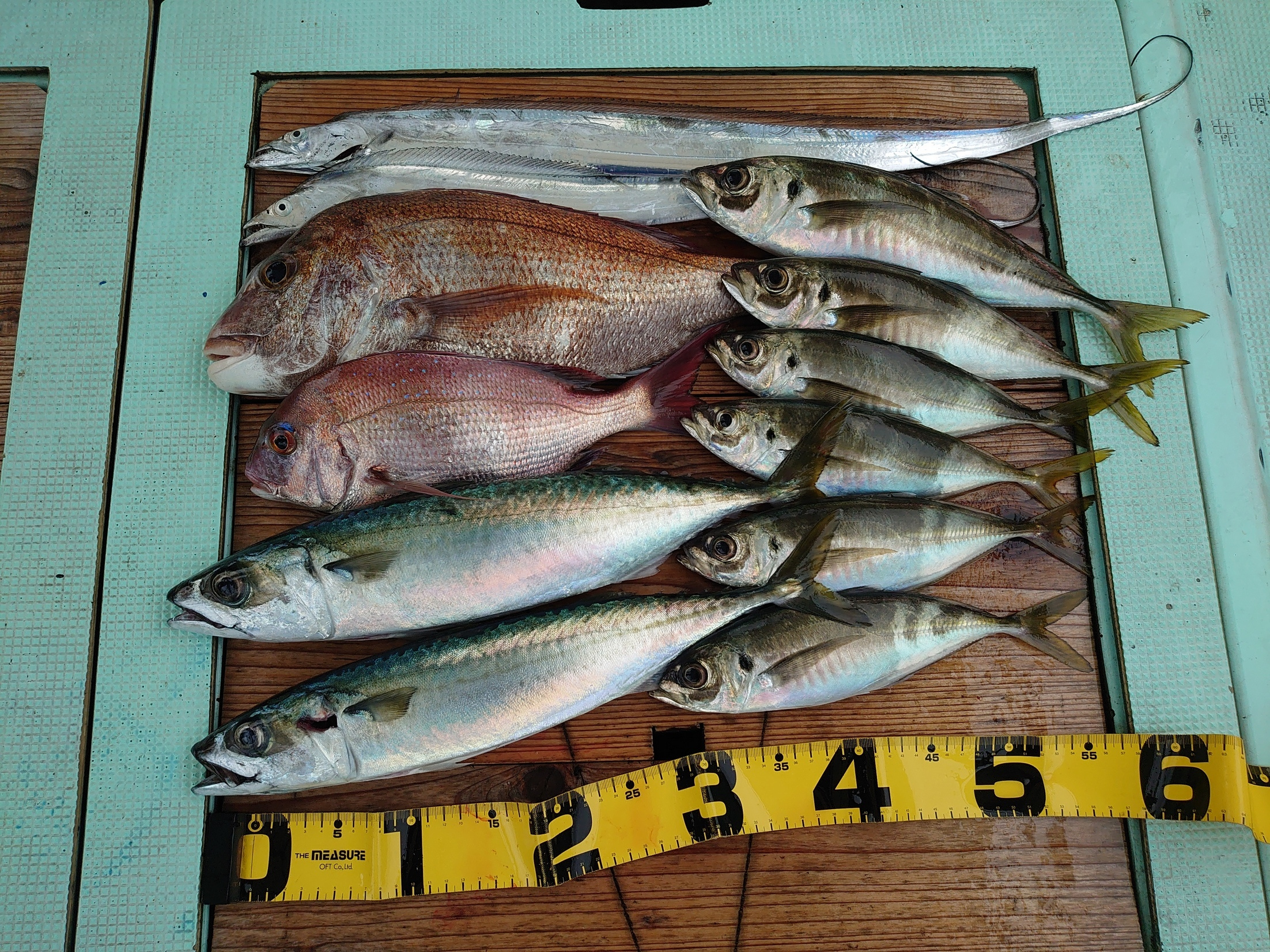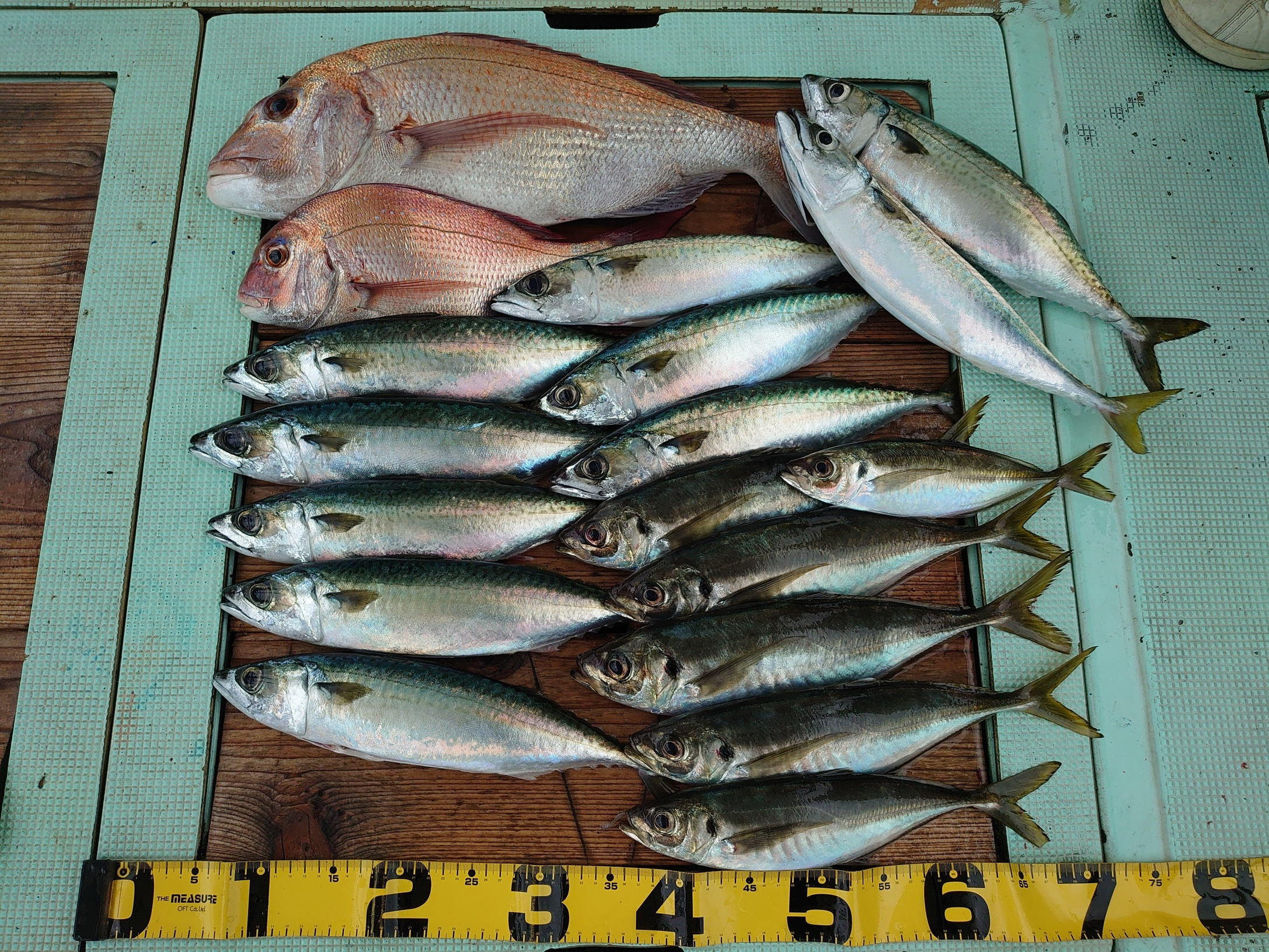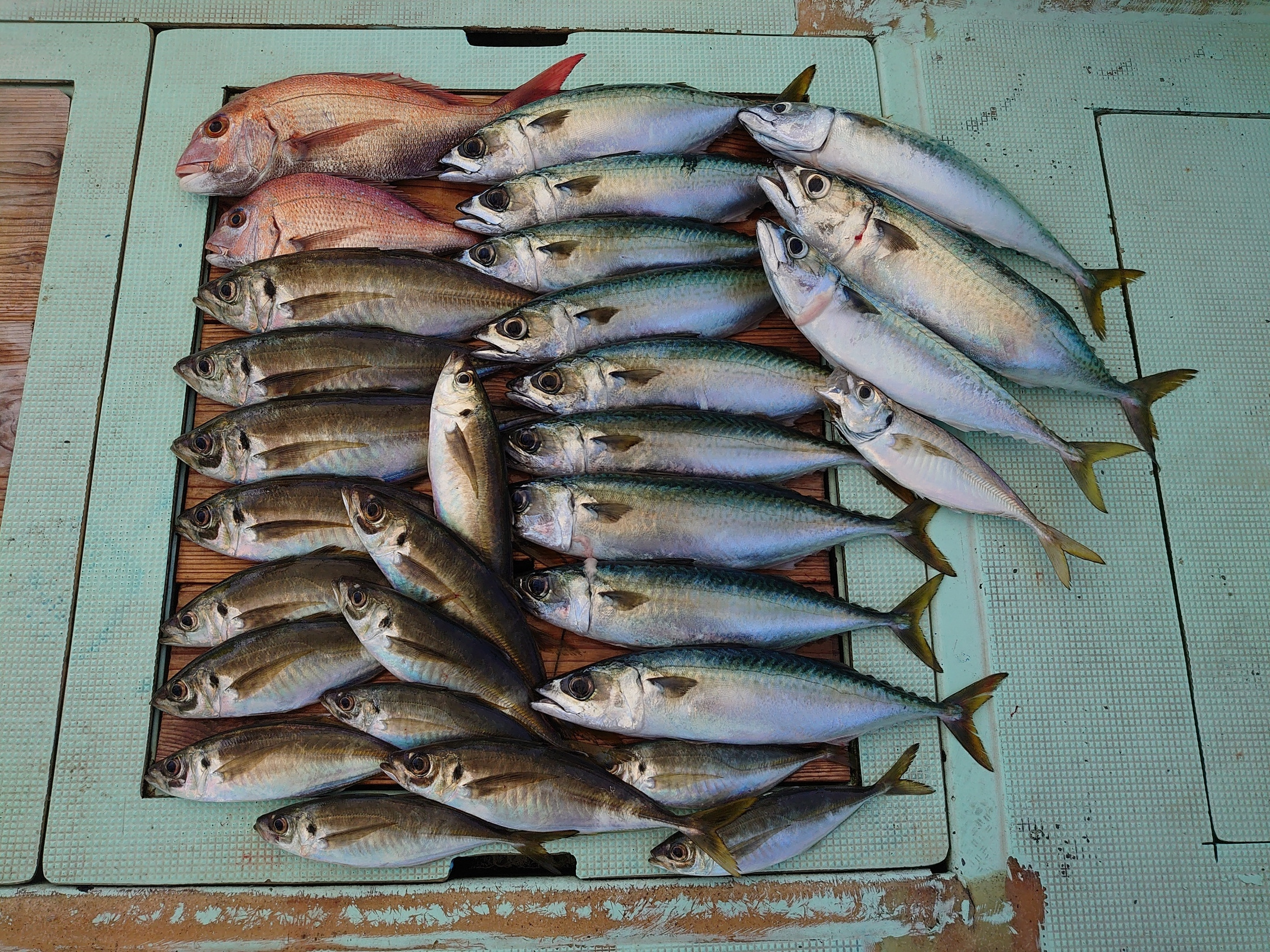 鯛 38~44cm 3匹、サバ 6匹、アジ 8匹
