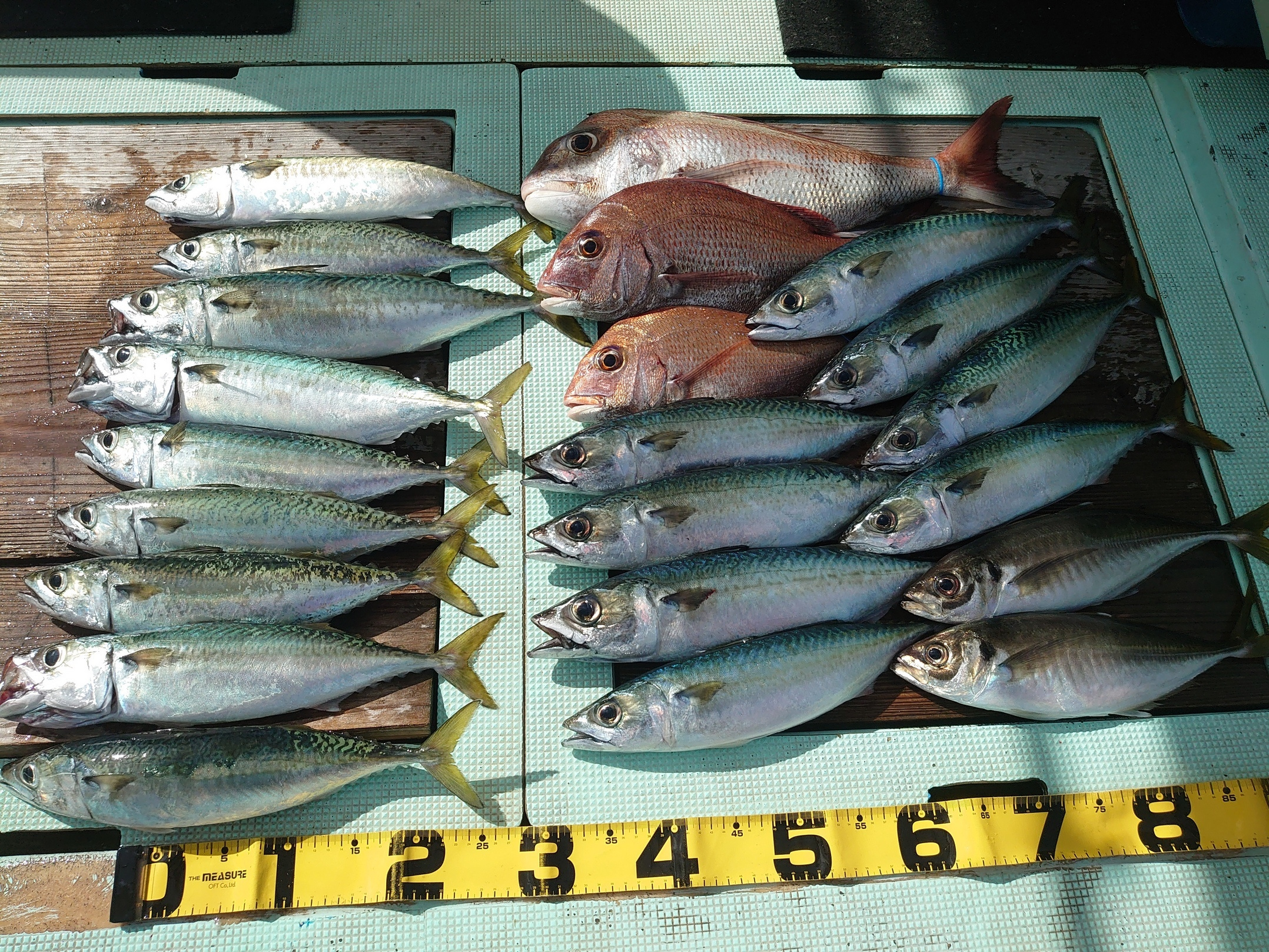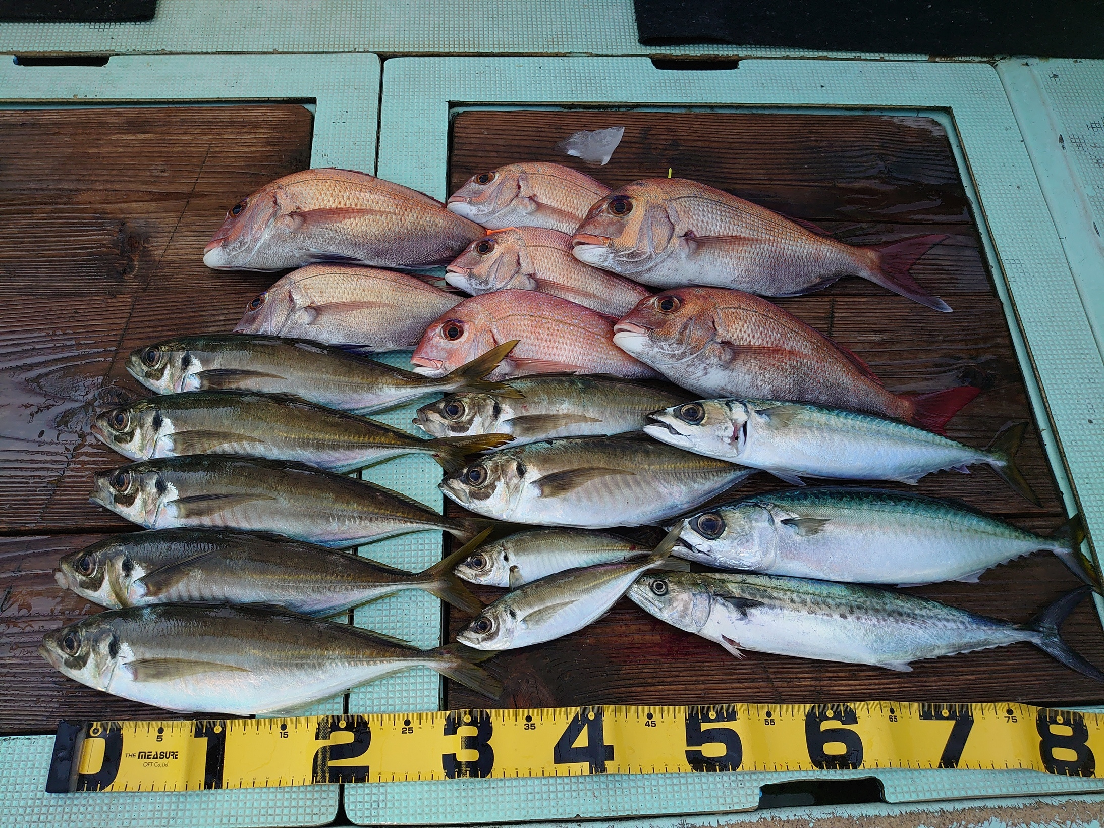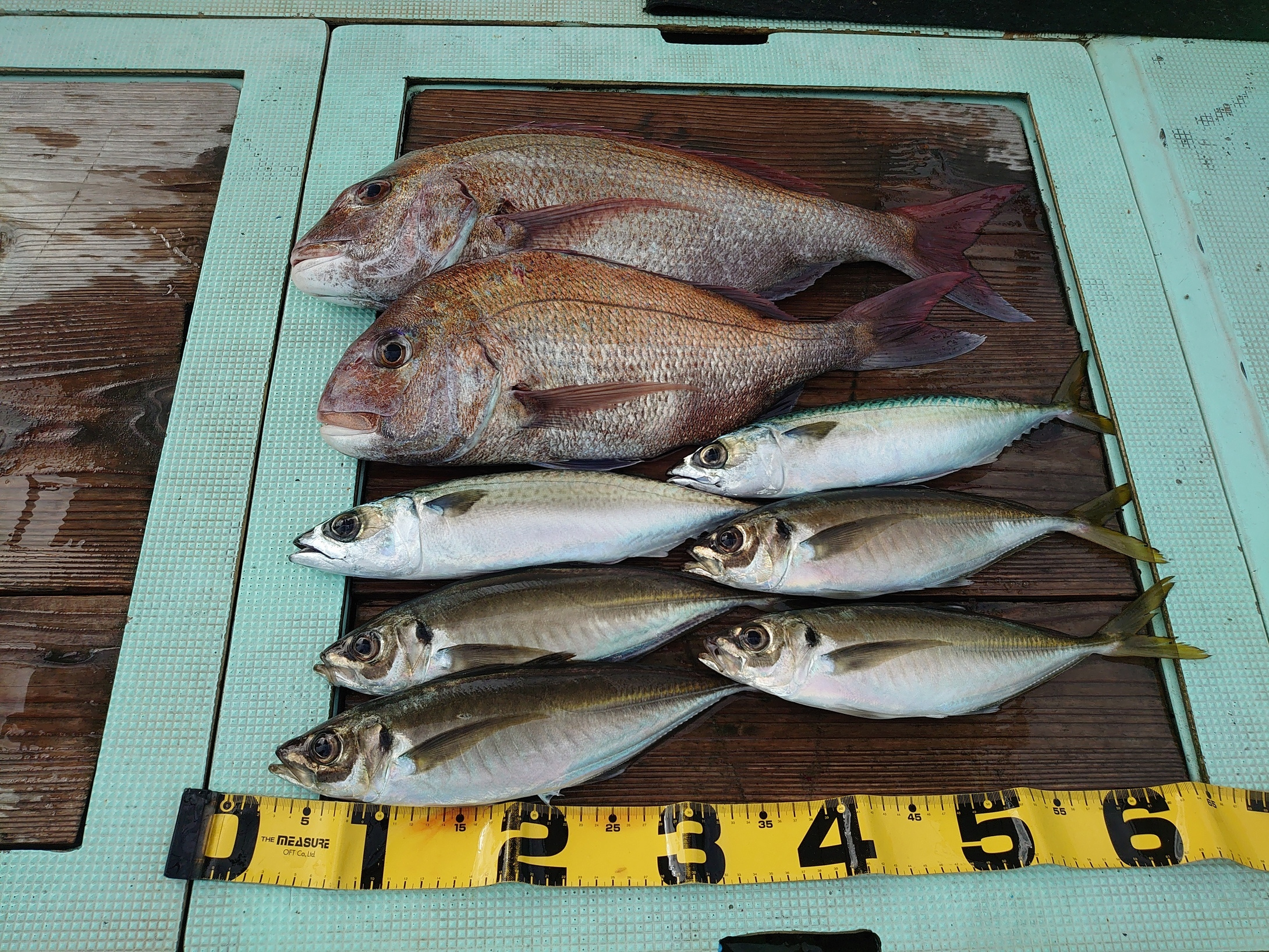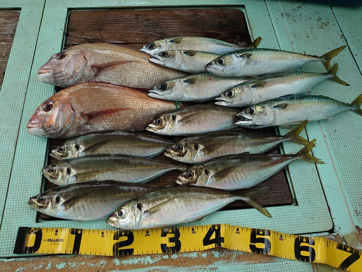 鯛 35~62cm 4匹、アジ 14匹、サバ 10匹