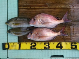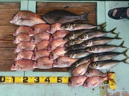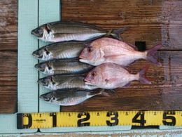 鯛 30~50cm 16匹、アジ 30~39cm 16匹、鯛 小8匹、セイゴ 2匹