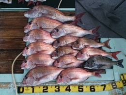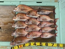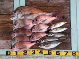 セイゴ 2匹、鯛 小30~33cm 7匹、イサギ 1匹、アジ 2匹、鯛 40~65cm 13匹