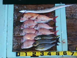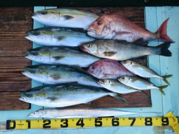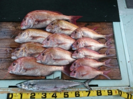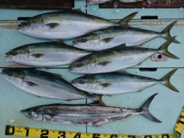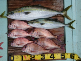 鯛 31~47cm 14匹、メジロ 63~73cm 6匹、イサギ 7匹、サワラ 82cm 1匹