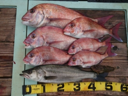 鯛 32~60cm 6匹、セイゴ 1匹、オコゼ 1匹