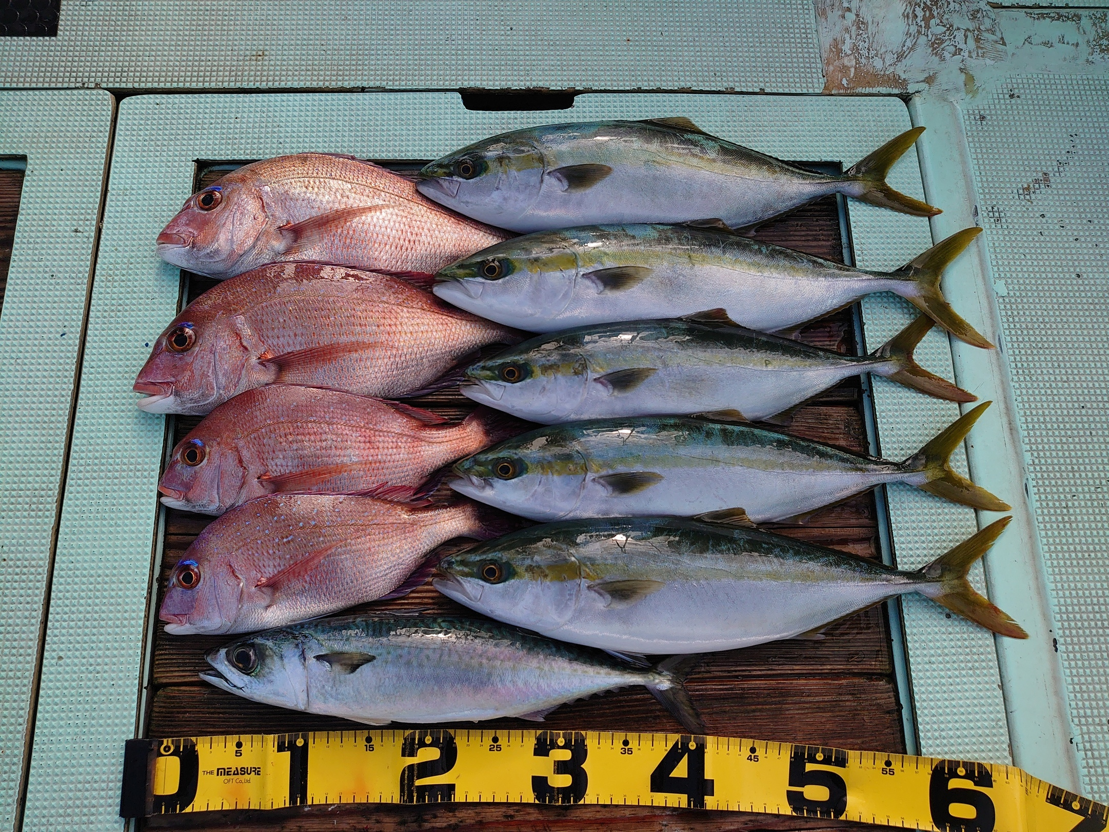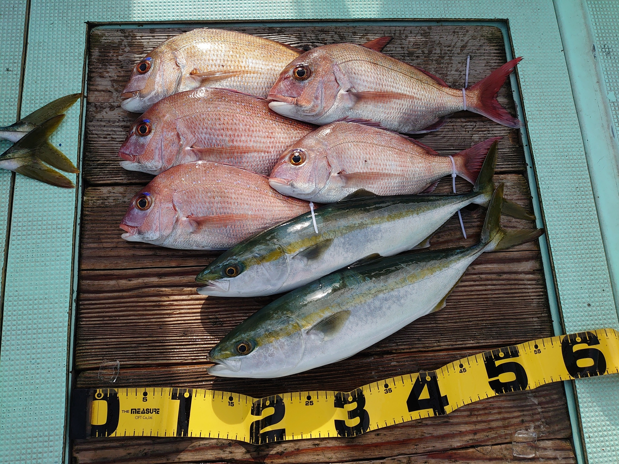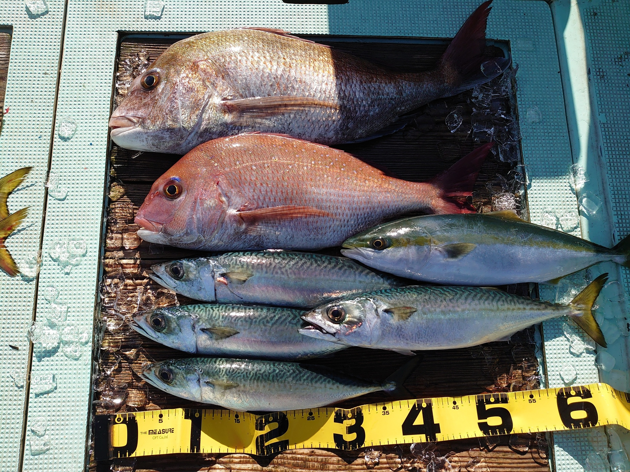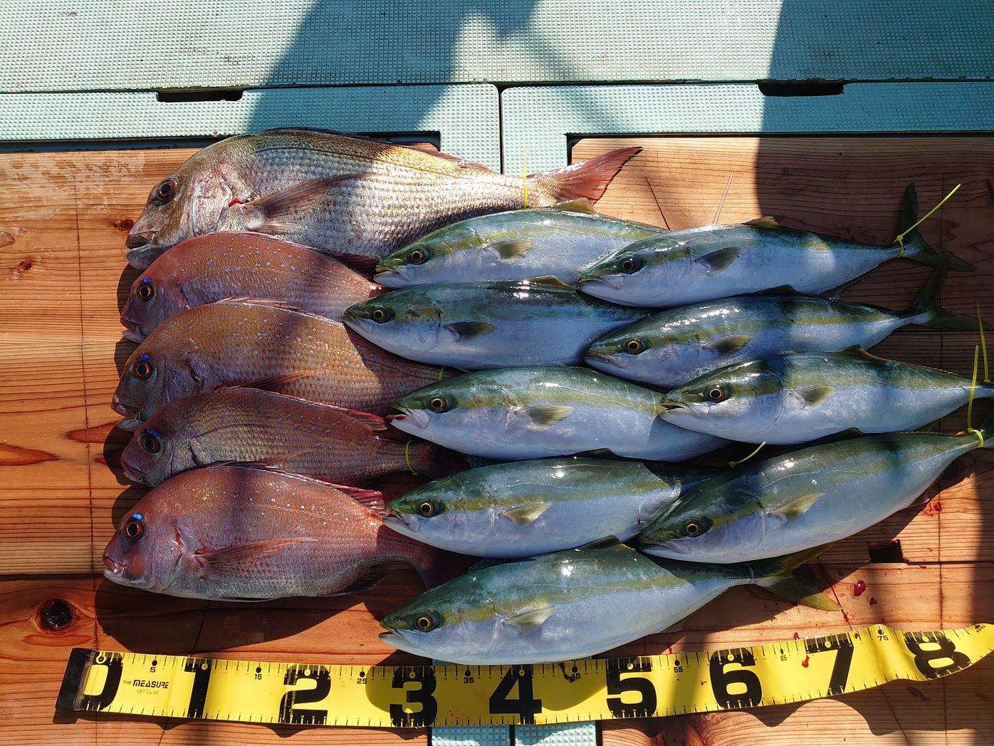 鯛 59~67cm 3匹、鯛 小1匹、ハマチ 7匹