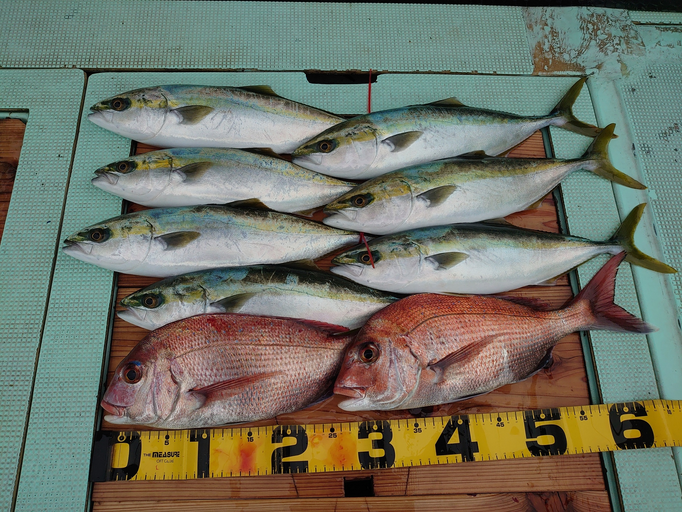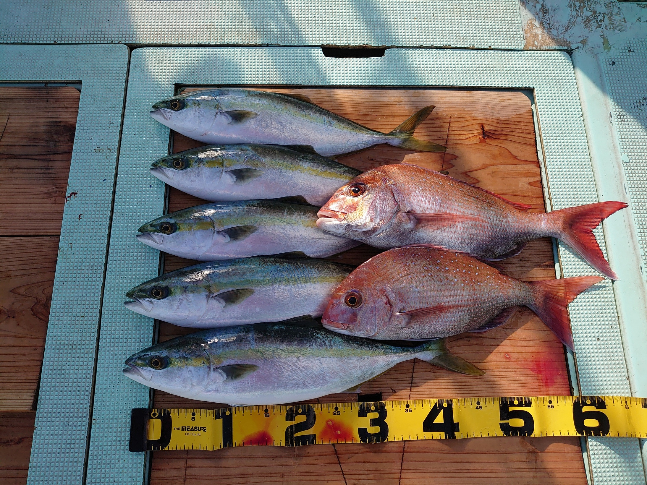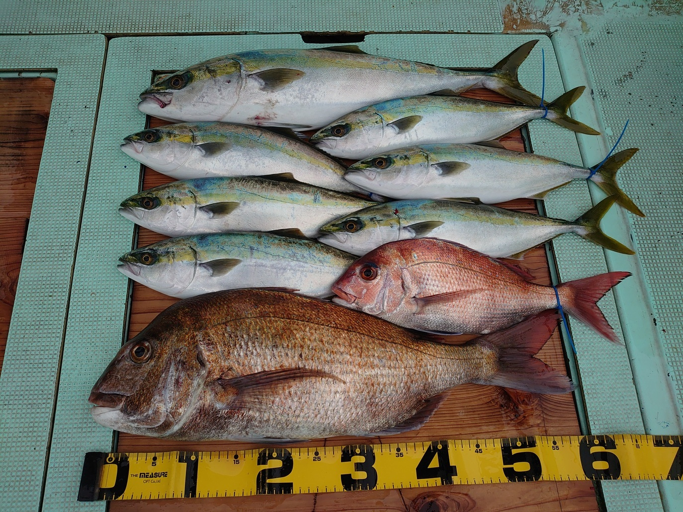 鯛 42、64cm 2匹、ハマチ 6匹、メジロ 1匹
