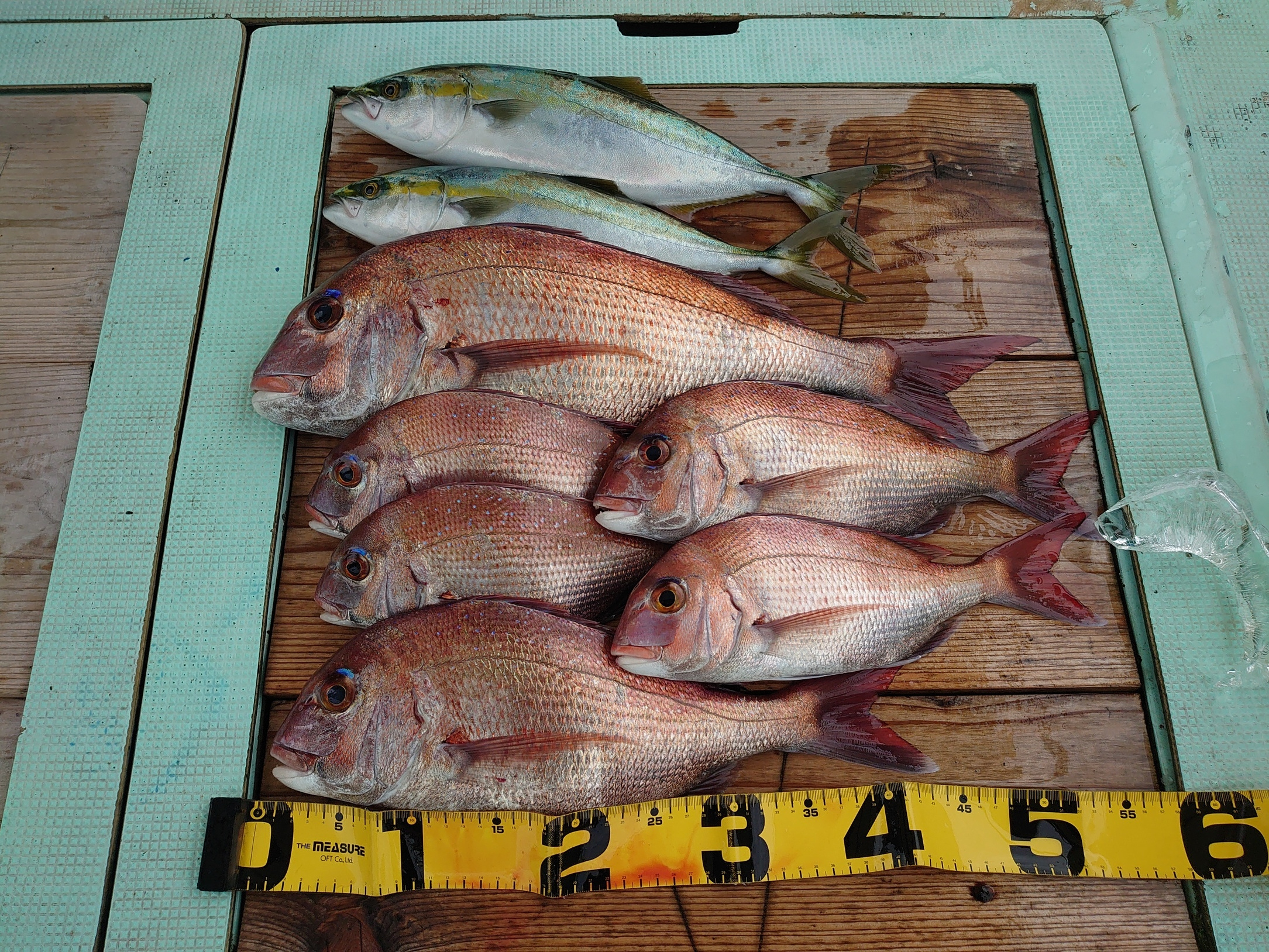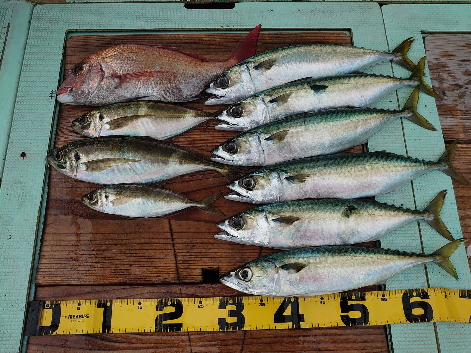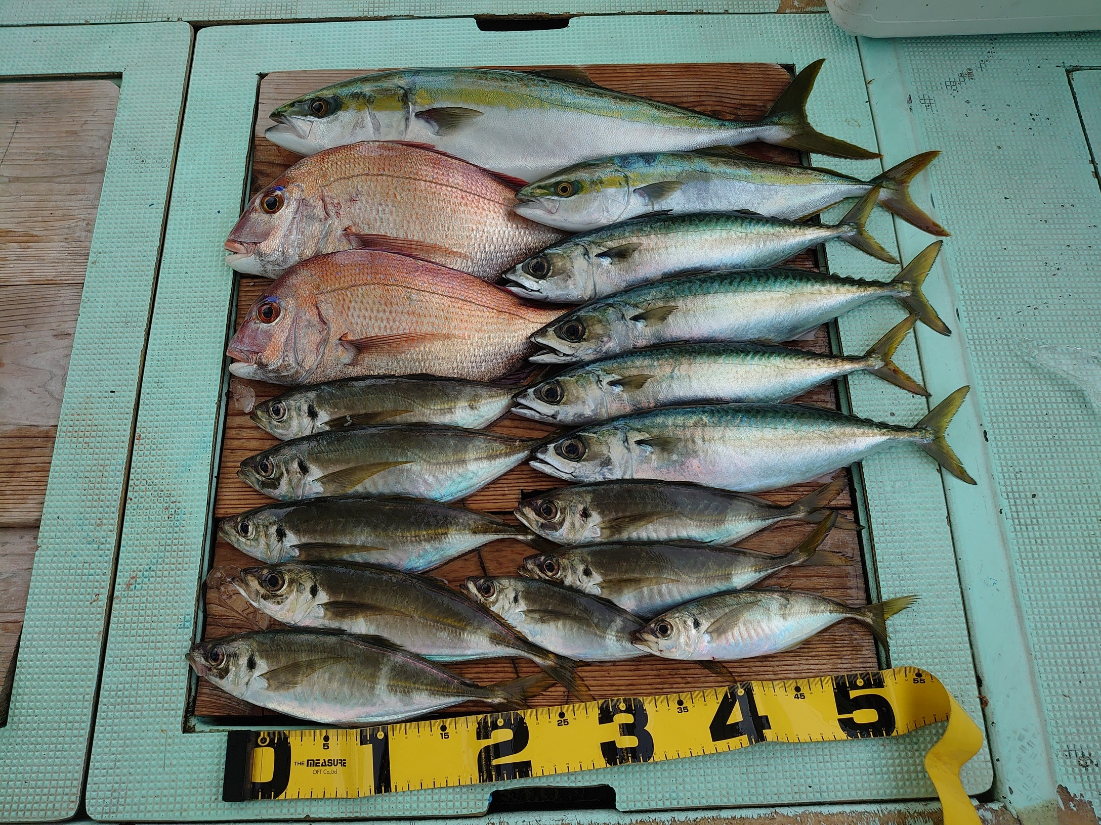 鯛 38~44cm 3匹、サバ 6匹、アジ 8匹