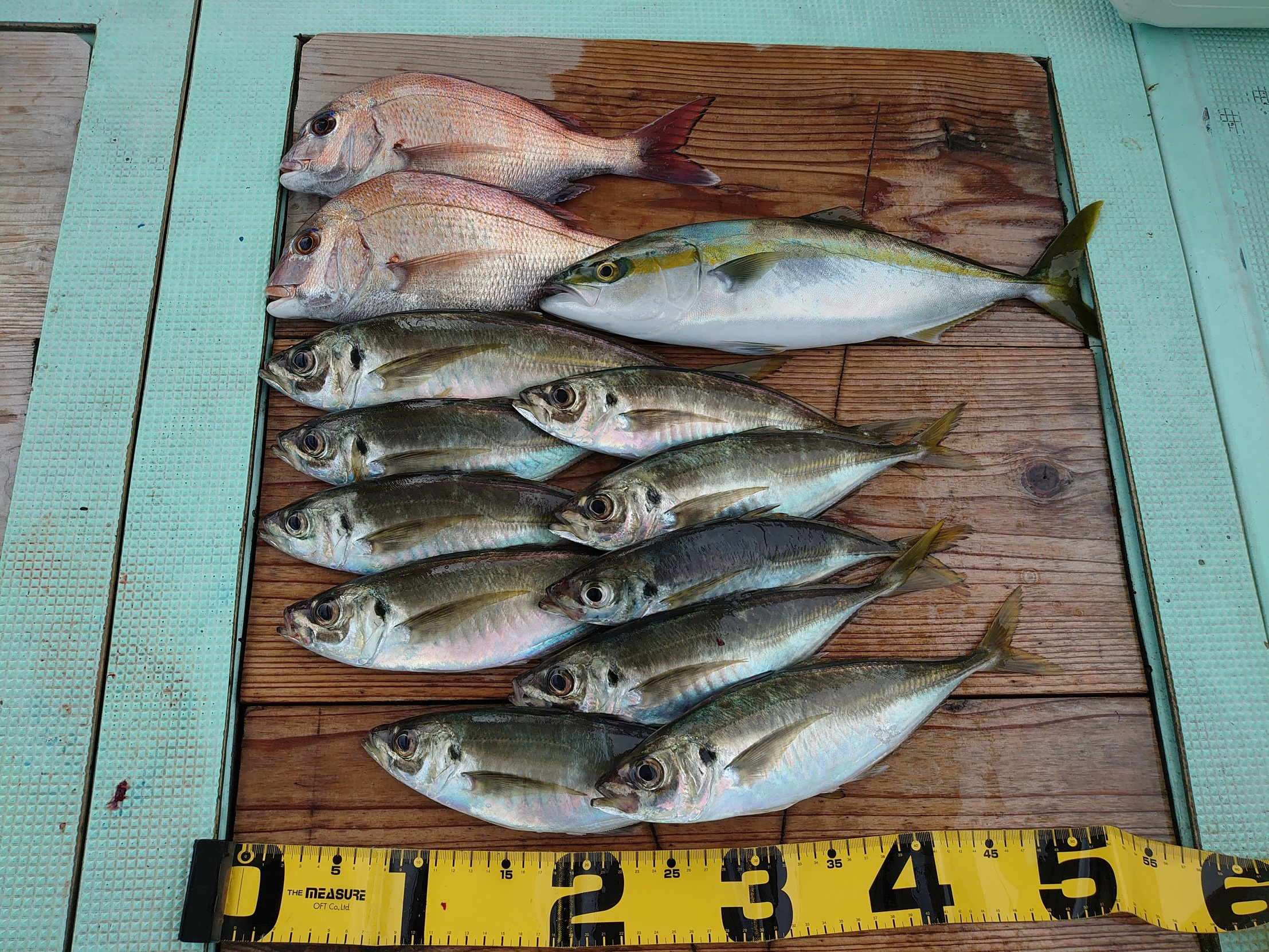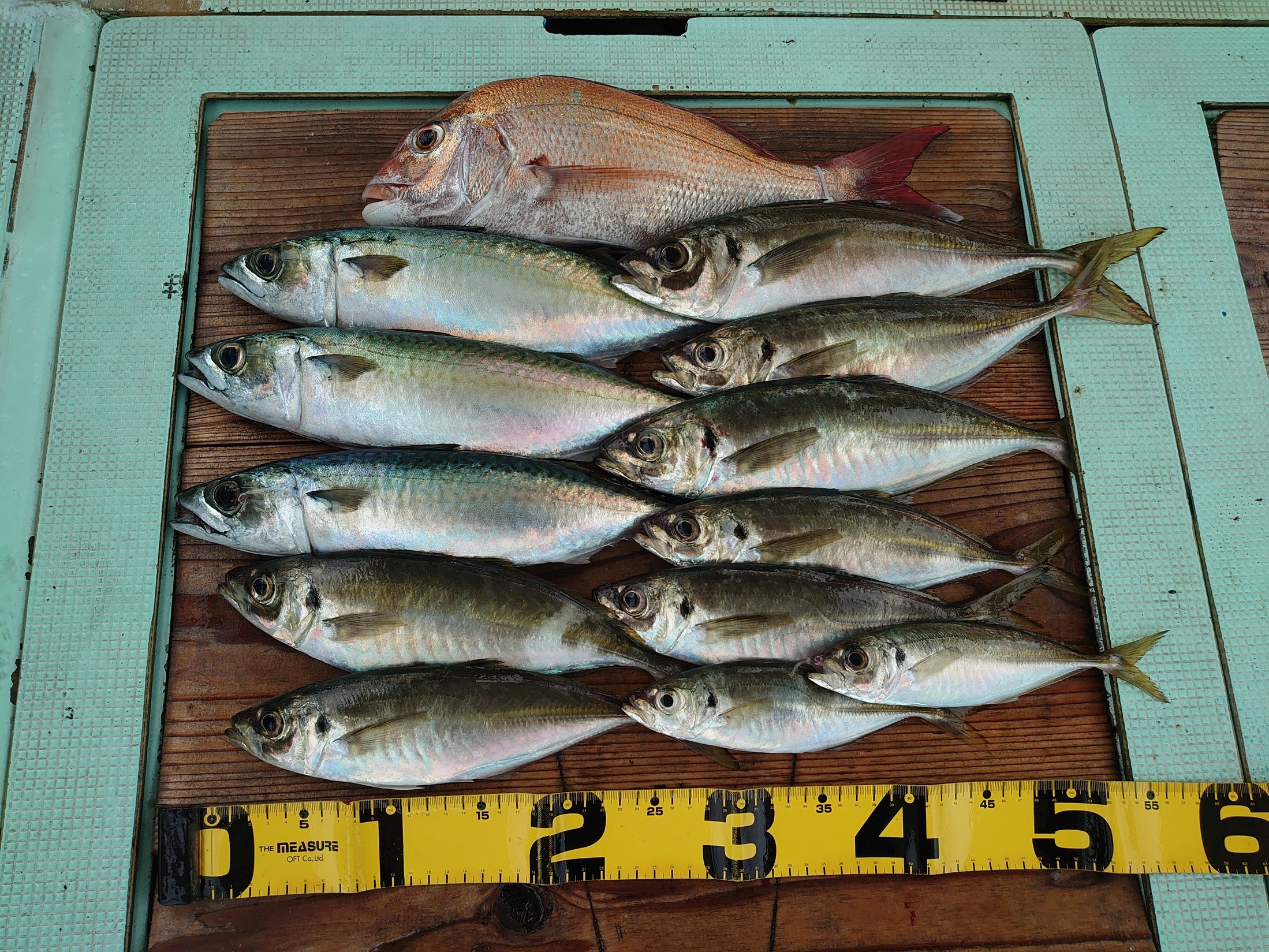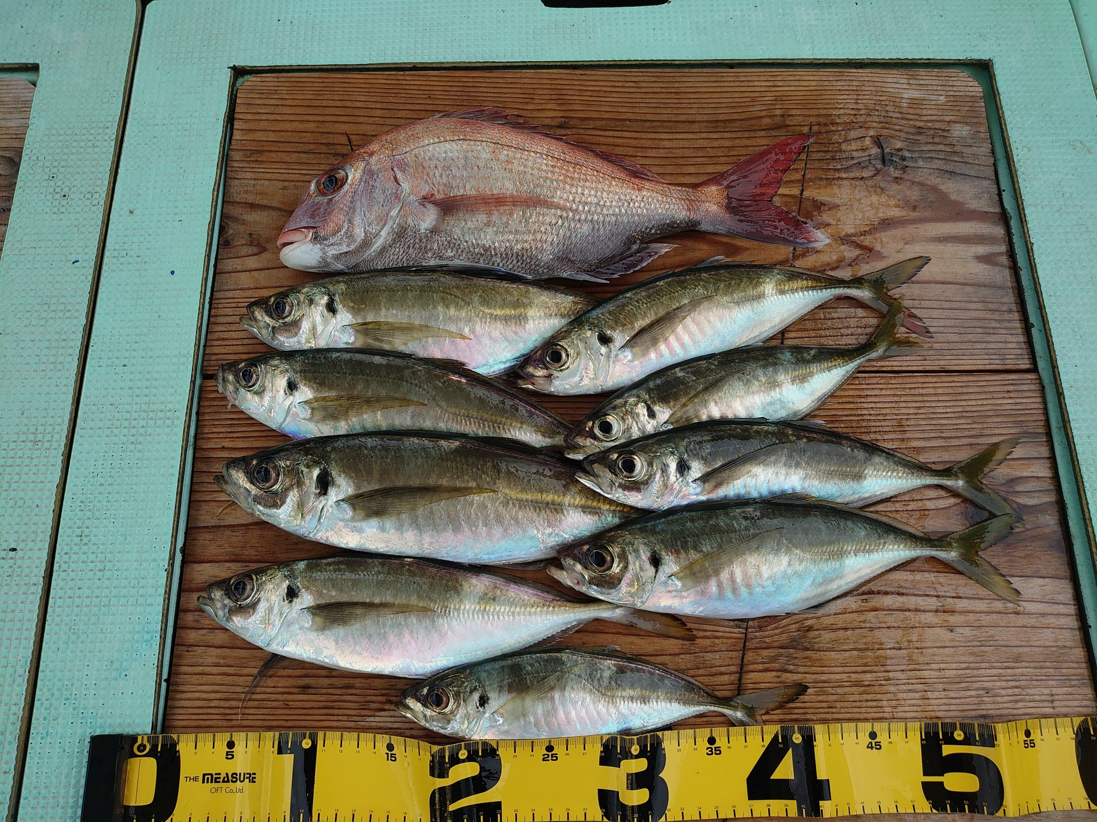 鯛 38~44cm 3匹、サバ 6匹、アジ 8匹