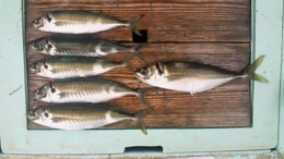 セイゴ57cm、アジ31~38cm5匹、丸アジ31cm2匹、ガシラ19~22cm3匹、イシモチ41cm