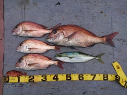 鯛 35~58cm 11匹、ハマチ 46~53cm 9匹、 メバル 1匹