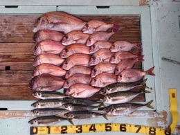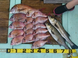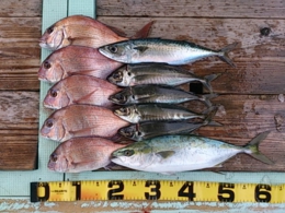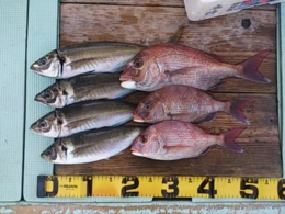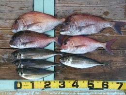 鯛 30~50cm 16匹、アジ 30~39cm 16匹、鯛 小8匹、セイゴ 2匹