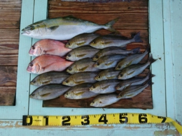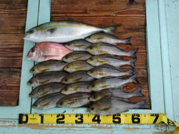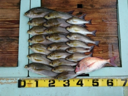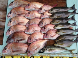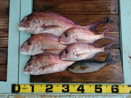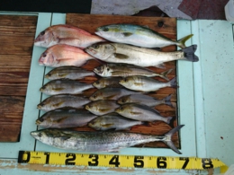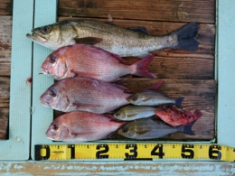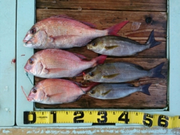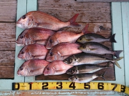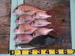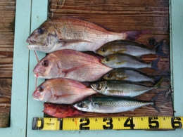 セイゴ 2匹、鯛 小30~33cm 7匹、イサギ 1匹、アジ 2匹、鯛 40~65cm 13匹