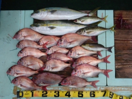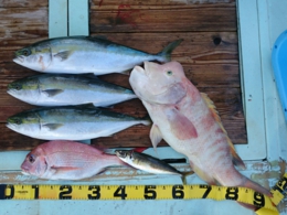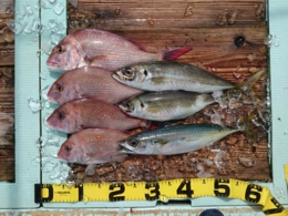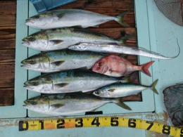 鯛 31~47cm 14匹、メジロ 63~73cm 6匹、イサギ 7匹、サワラ 82cm 1匹