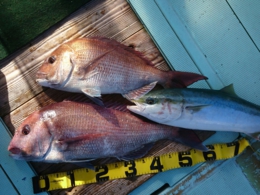 鯛33~44cm 4匹、55~80cm 4匹、メジロ 1匹、サバ 1匹