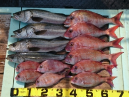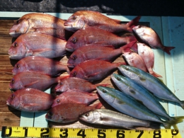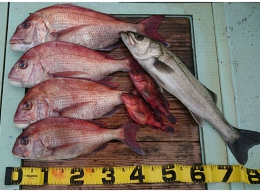 鯛 32~60cm 6匹、セイゴ 1匹、オコゼ 1匹