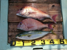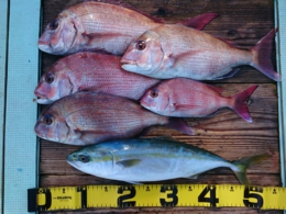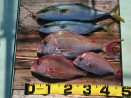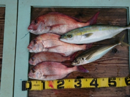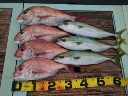 鯛 62cm 1匹、ハマチ 2匹、アジ 1匹