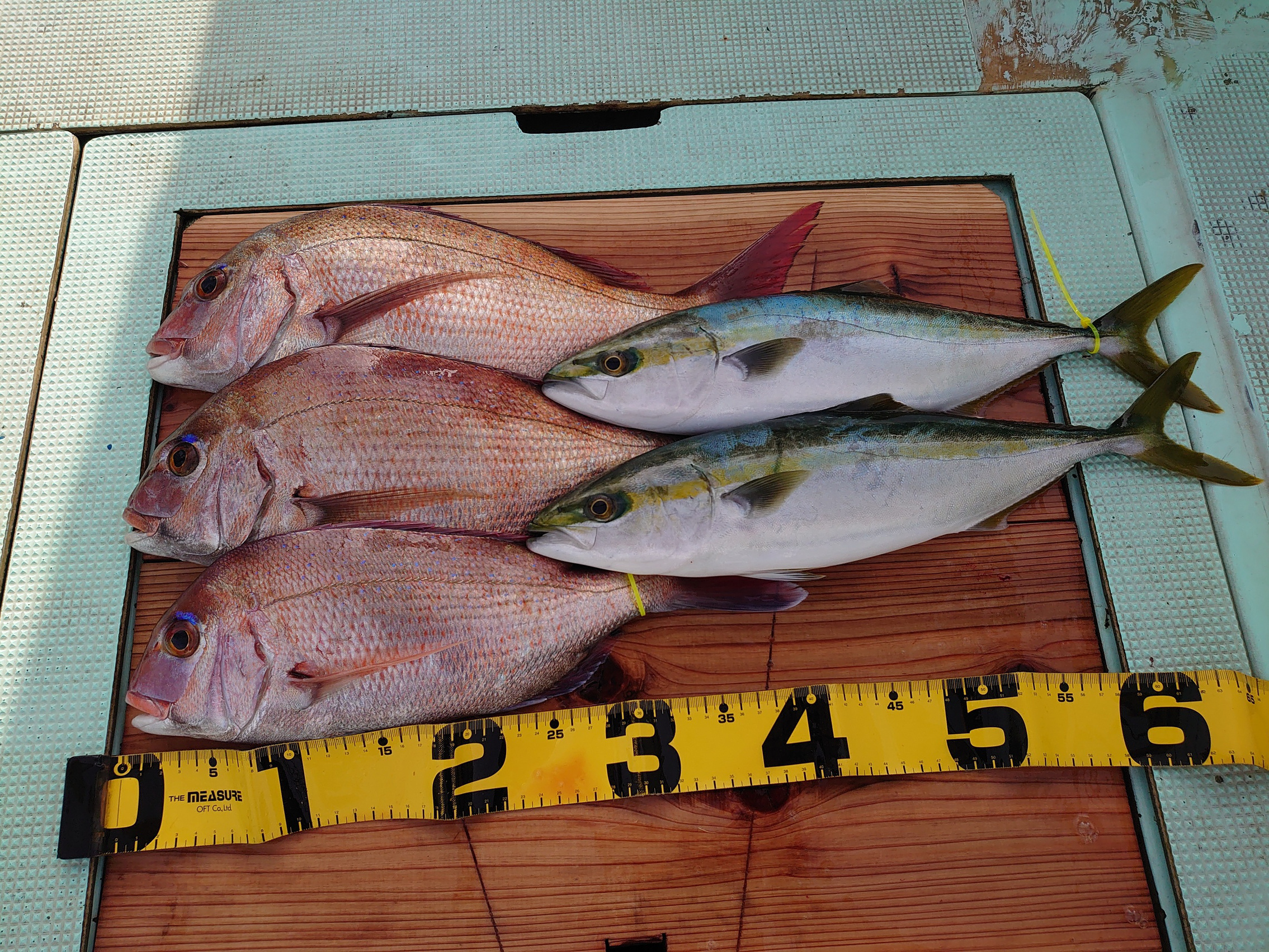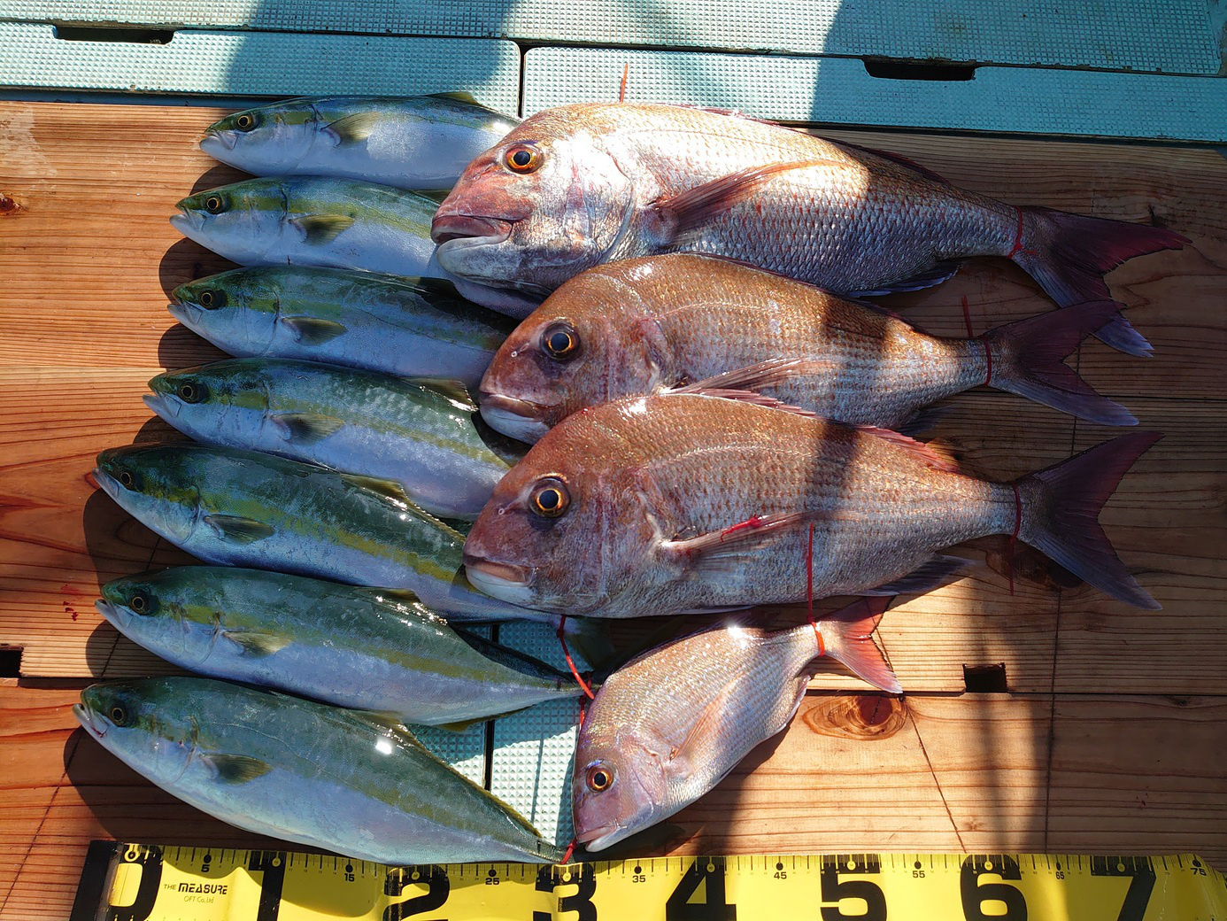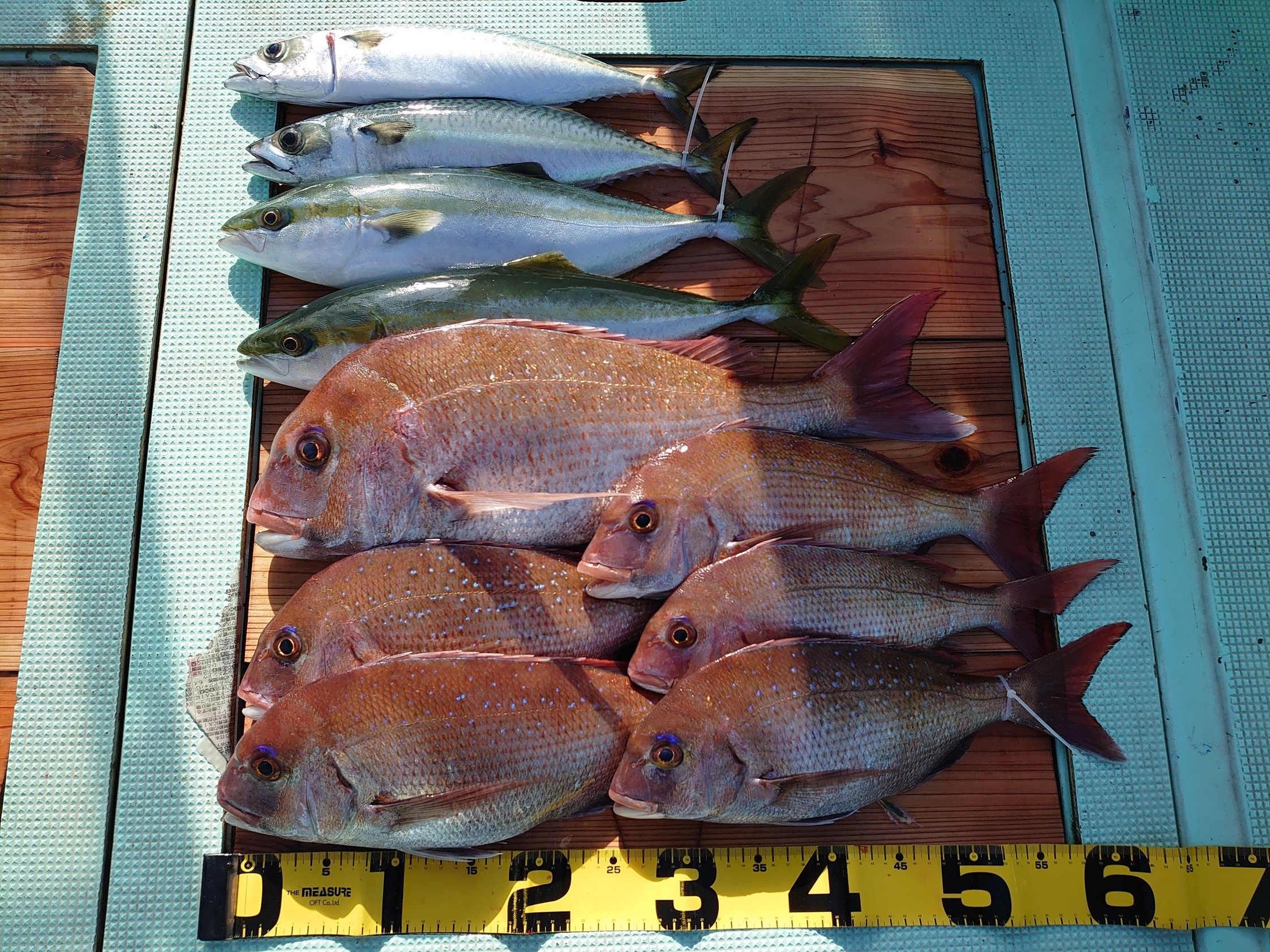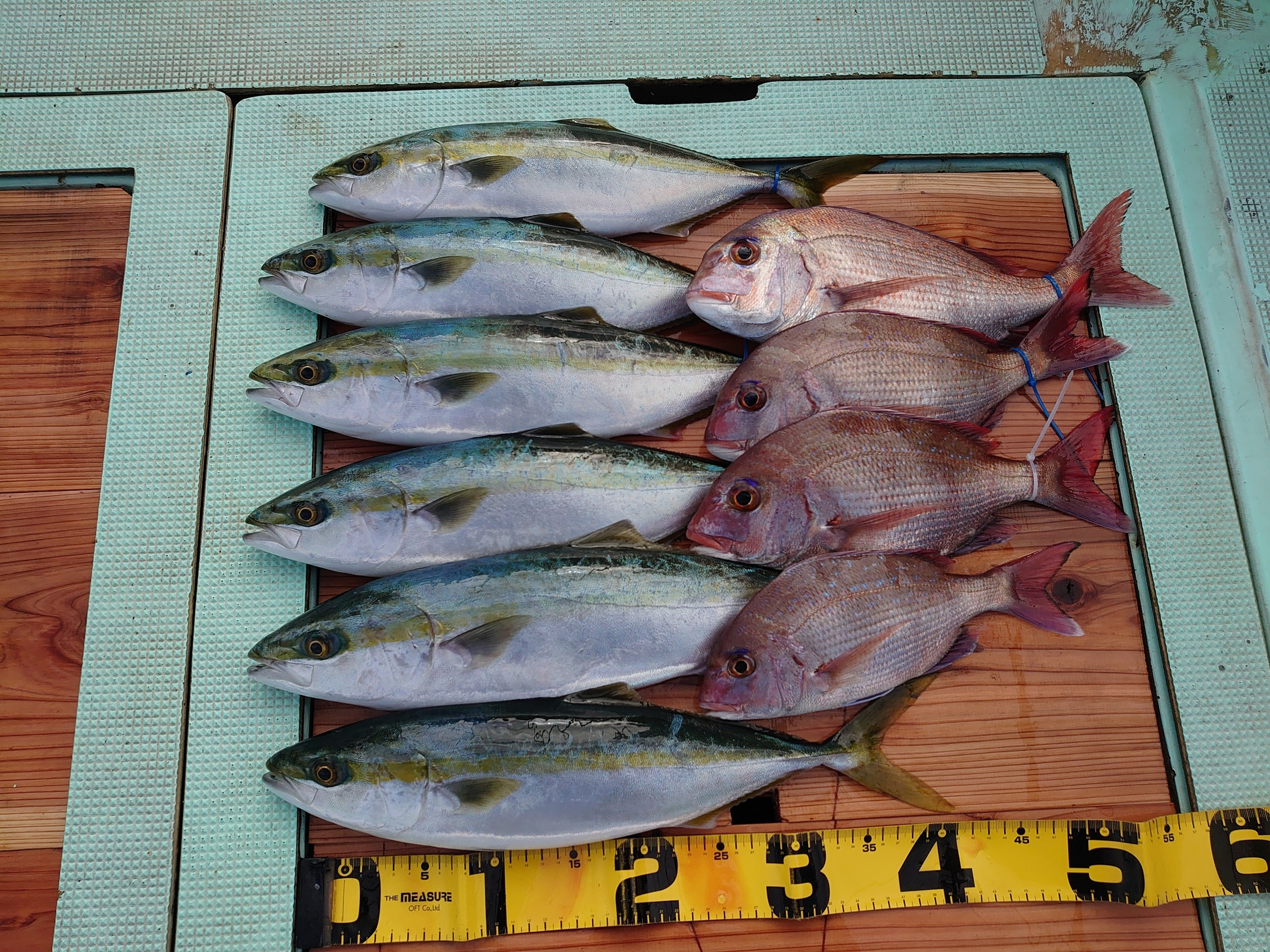 鯛 59~67cm 3匹、鯛 小1匹、ハマチ 7匹