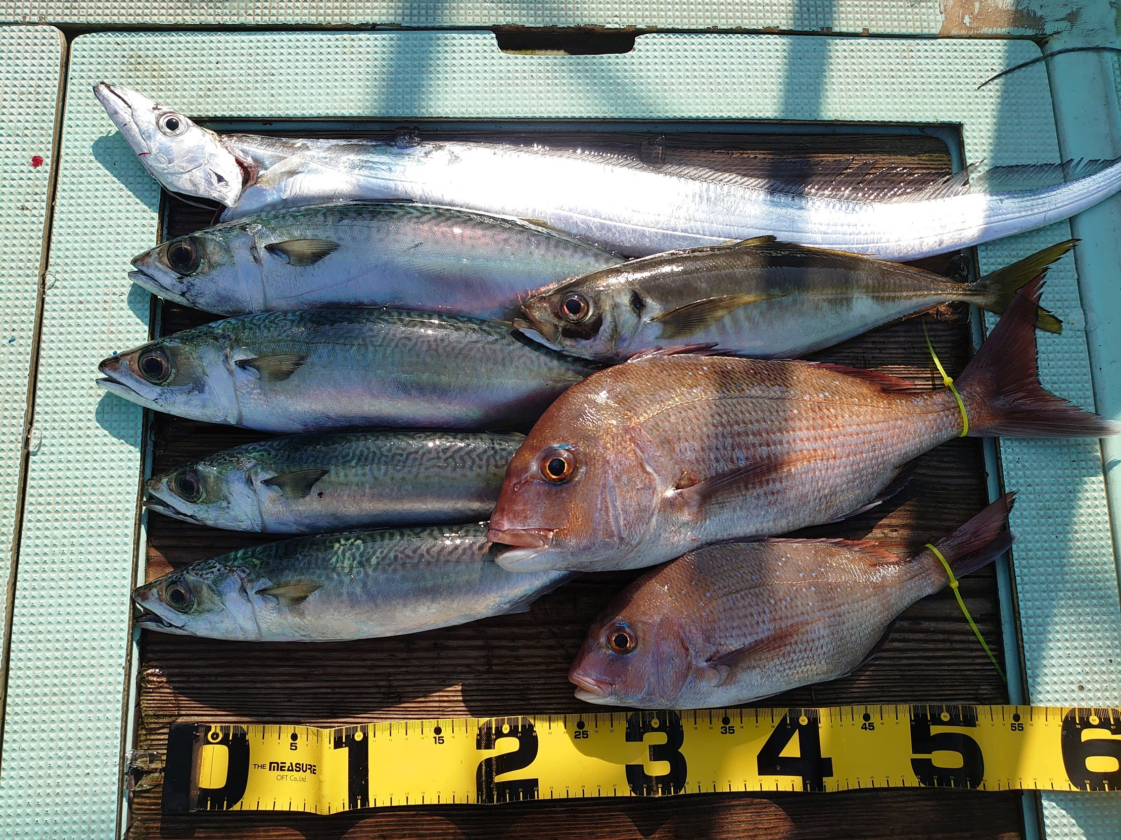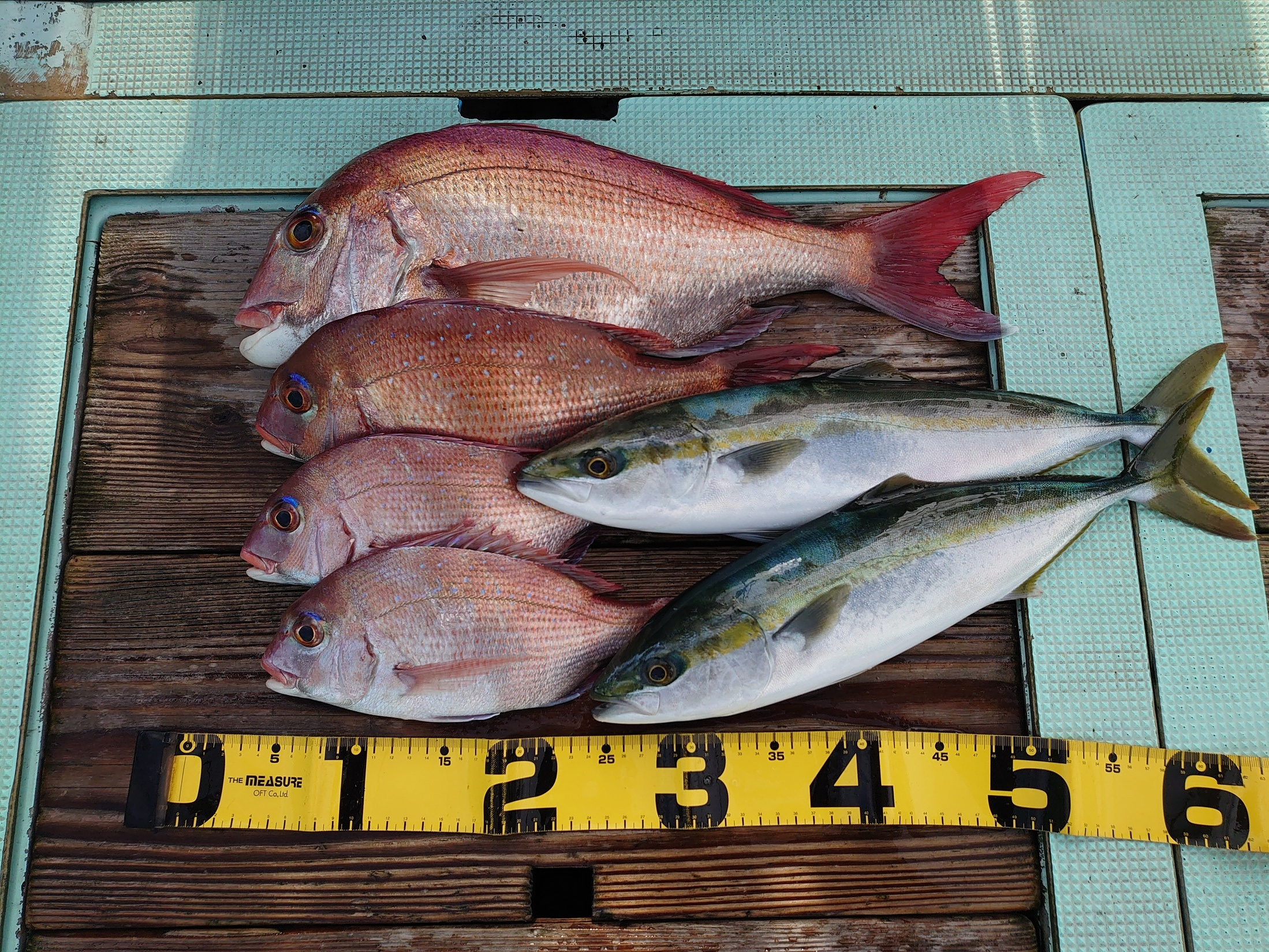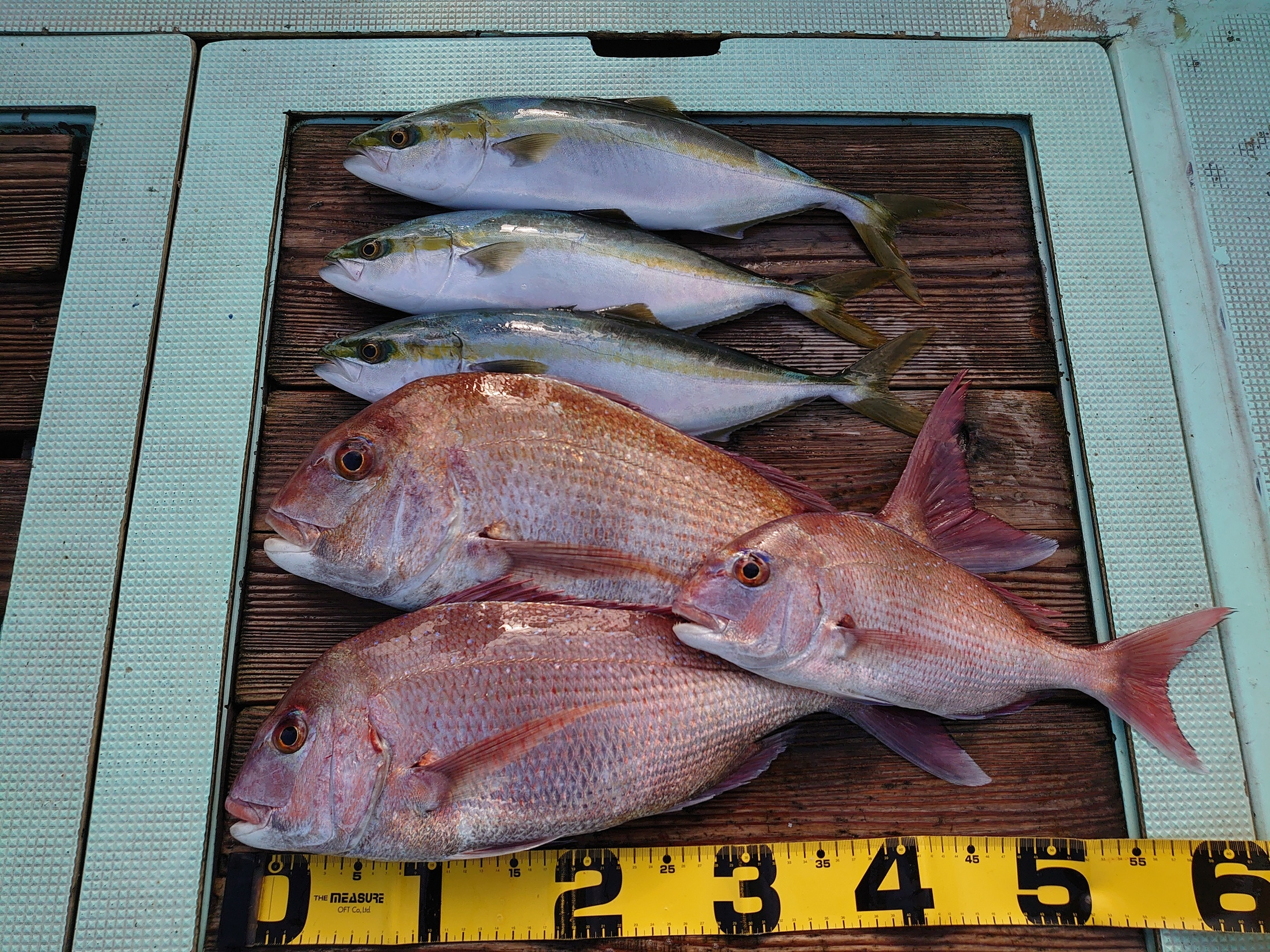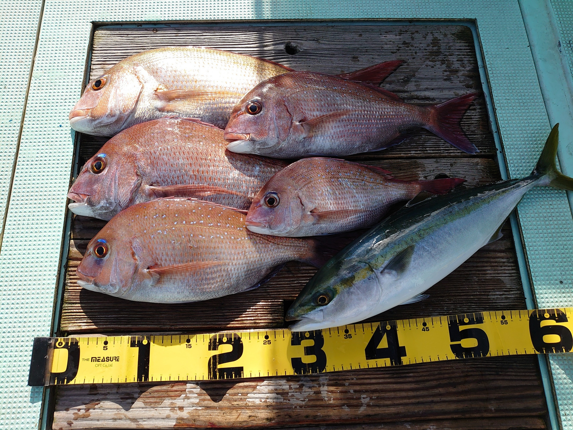鯛 59~67cm 3匹、鯛 小1匹、ハマチ 7匹