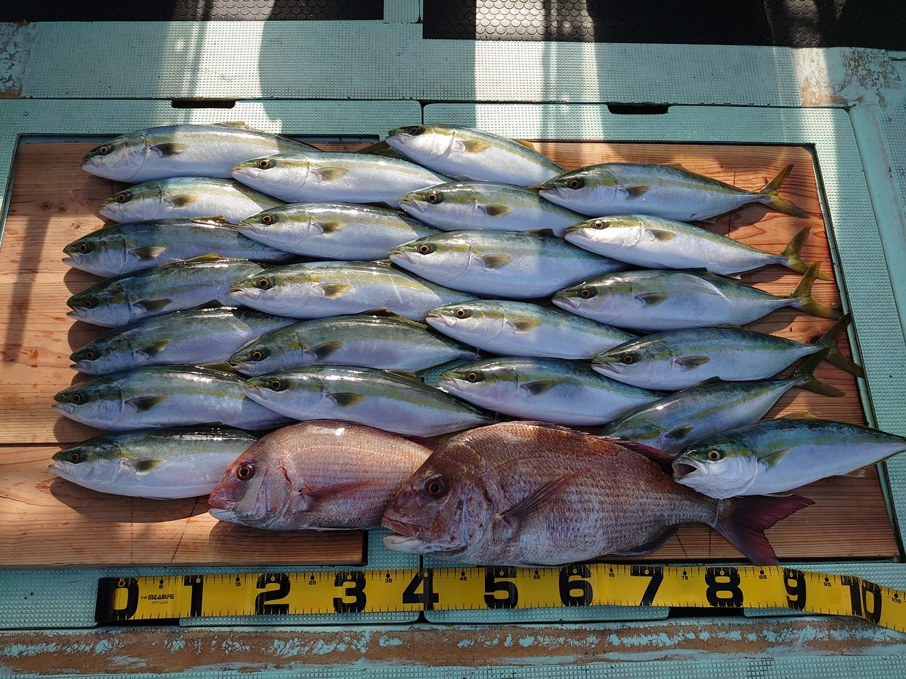 鯛 42、64cm 2匹、ハマチ 6匹、メジロ 1匹