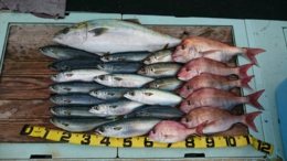 鯛 30~54cm 6匹、鰤 94cm 1匹、サバ 15匹、アジ 3匹