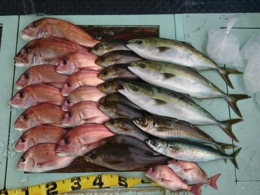 鯛 37、44cm 2匹、鰤 98cm 1匹、アコウ 1匹